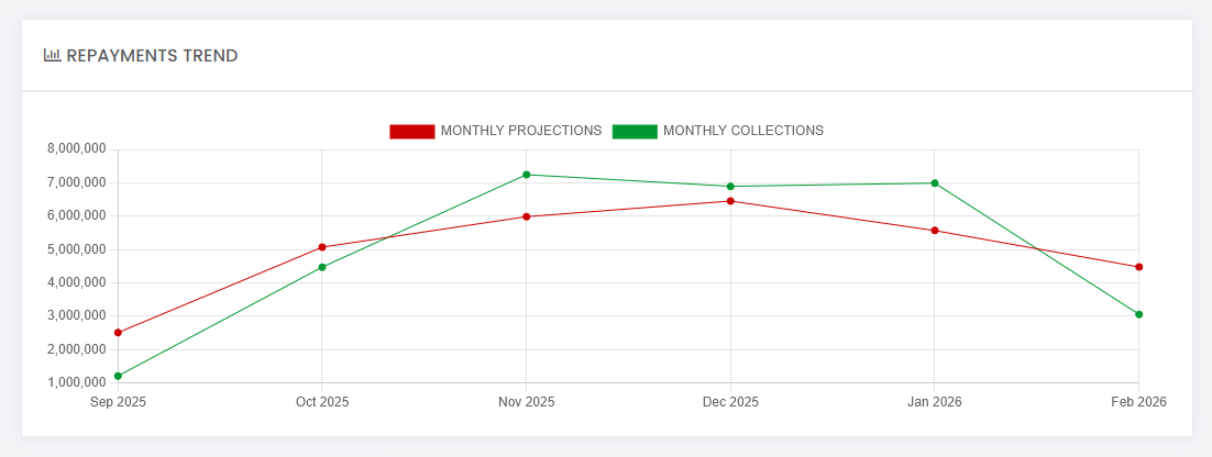 Monthly performance charts, Disbursement and Collections progress trend, Debts tracking tools and Reports Studio.