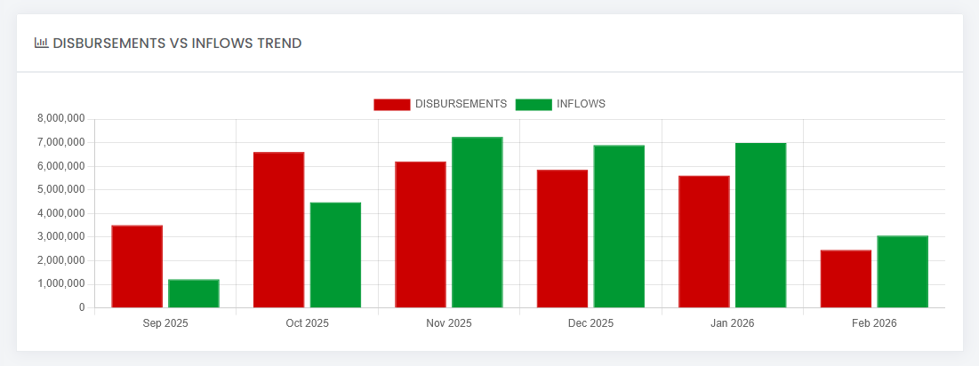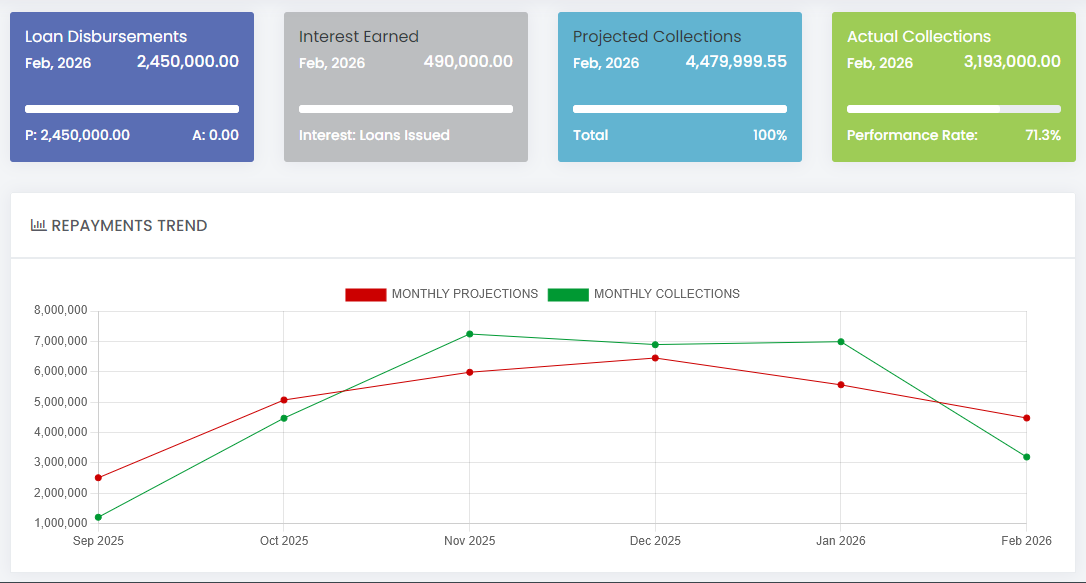 Monthly performance charts, Disbursement and Collections progress trend, Debts tracking tools and Reports Studio.